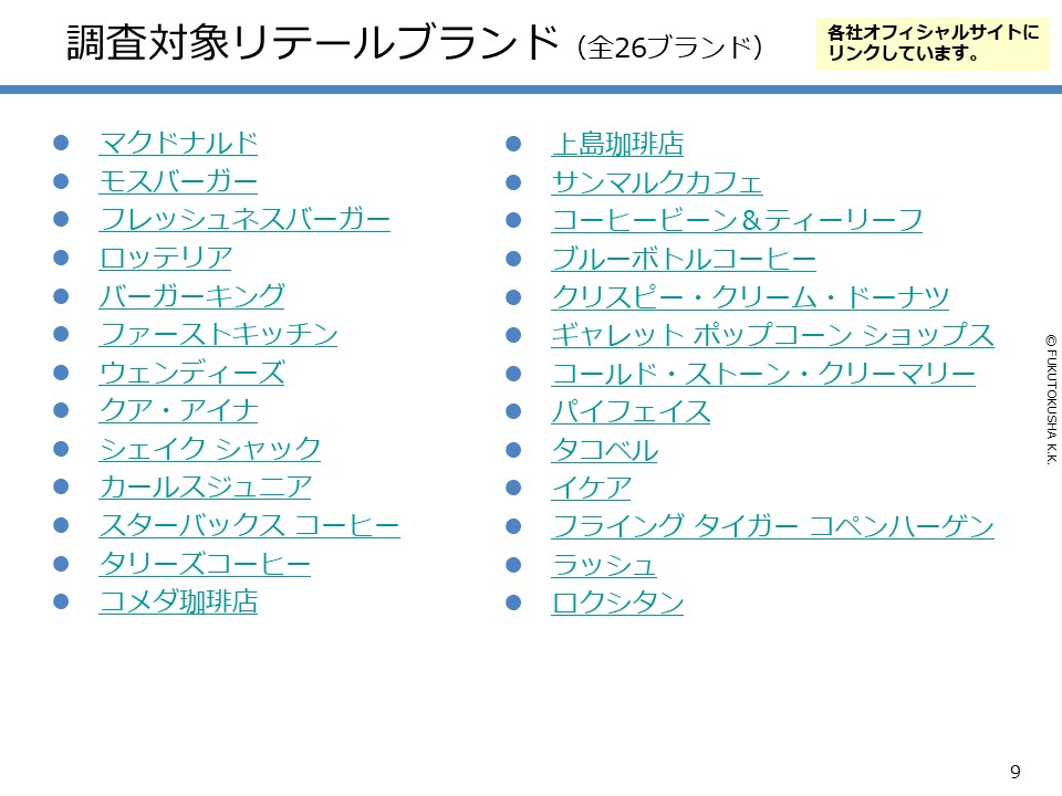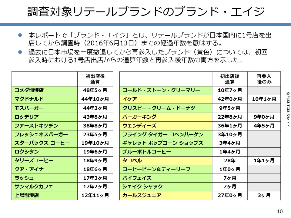 - 【調査対象ブランドについて】 ①調査対象全26ブランド ②ブランド・エイジ ③1号店開店年(年表)