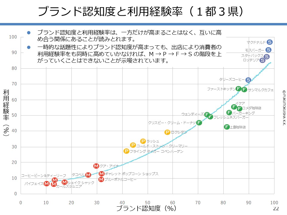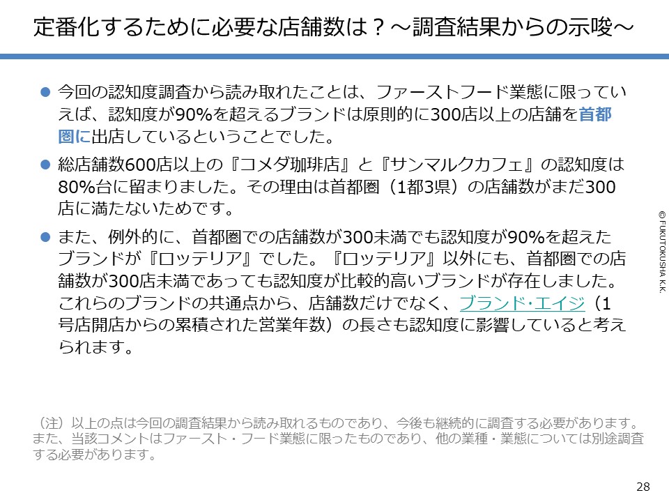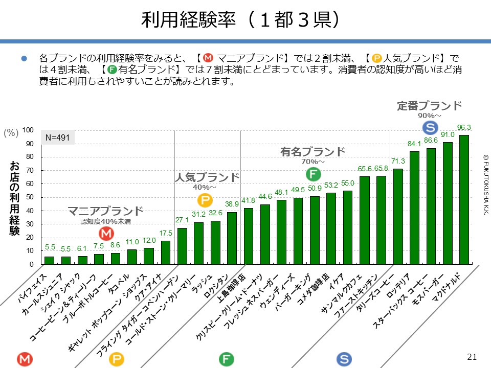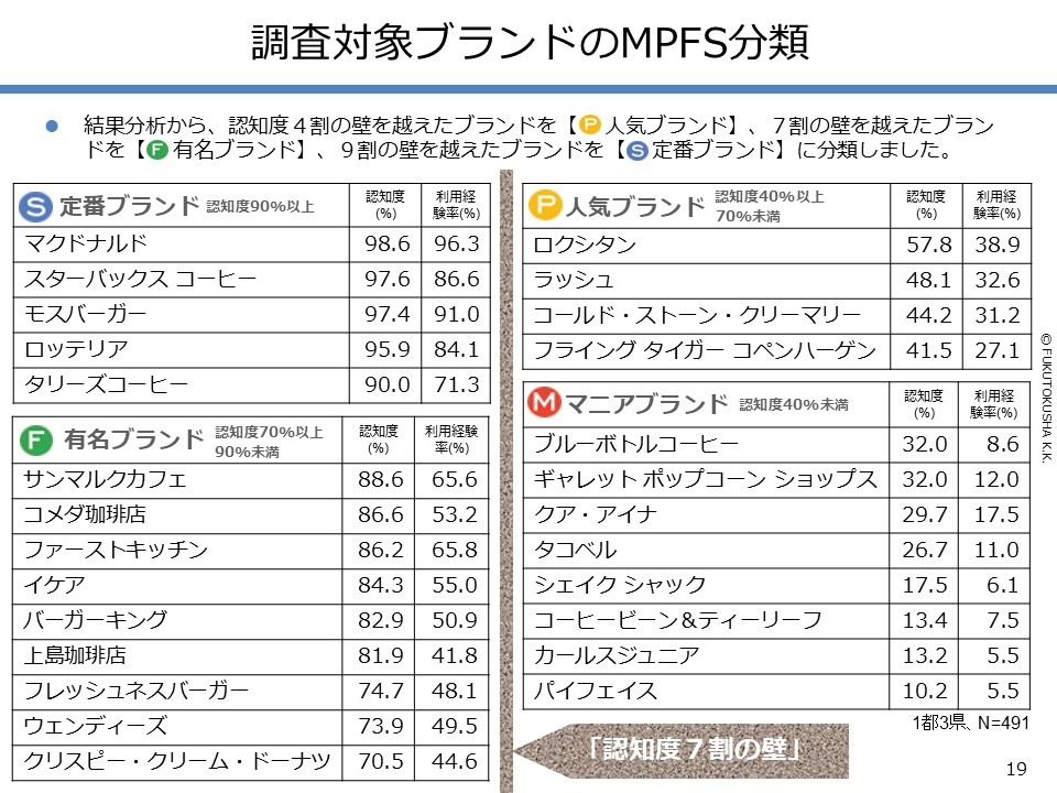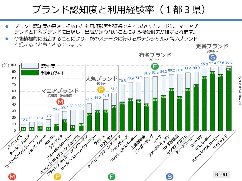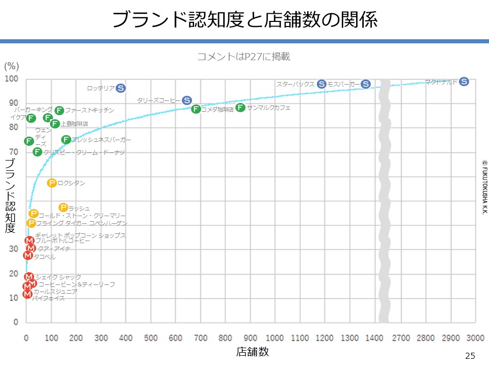 - 【調査結果のMPFS分析】 ①調査対象ブランドのMPFS分類 ②ブランド認知度(1都3県) ③利用経験率(1都3県) ④認知度と利用経験率の関係 ⑤認知者に占める未利用者の割合 ⑥ブランド認知度と店舗数の関係 ⑦利用経験率と店舗数の関係 ⑧認知度とブランド・エイジの関係 ⑨定番化するために必要な店舗数 ⑩定番化するための出店戦略
