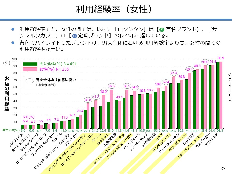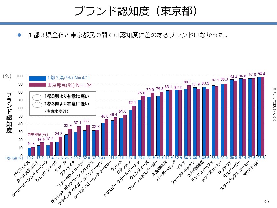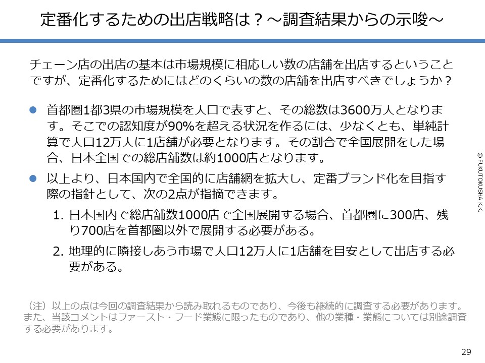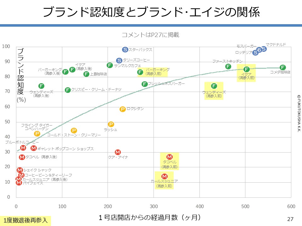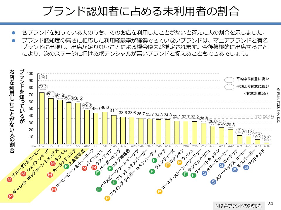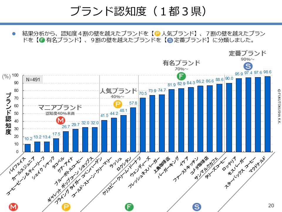 - 【調査結果のMPFS分析】 ①調査対象ブランドのMPFS分類 ②ブランド認知度(1都3県) ③利用経験率(1都3県) ④認知度と利用経験率の関係 ⑤認知者に占める未利用者の割合 ⑥ブランド認知度と店舗数の関係 ⑦利用経験率と店舗数の関係 ⑧認知度とブランド・エイジの関係 ⑨定番化するために必要な店舗数 ⑩定番化するための出店戦略