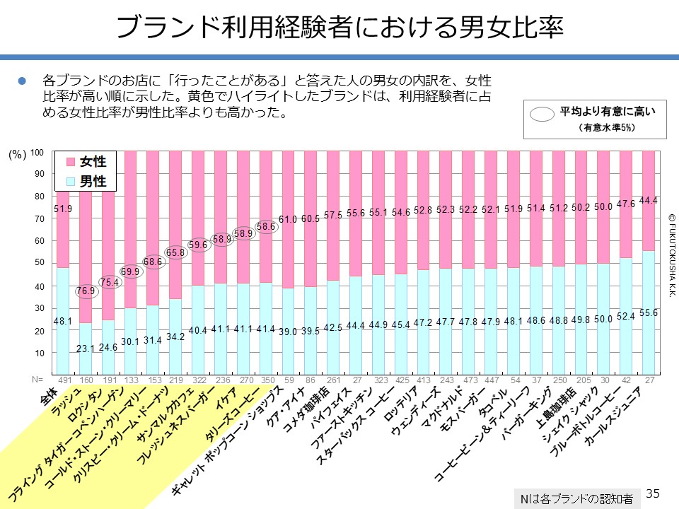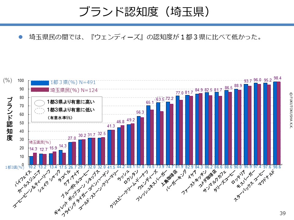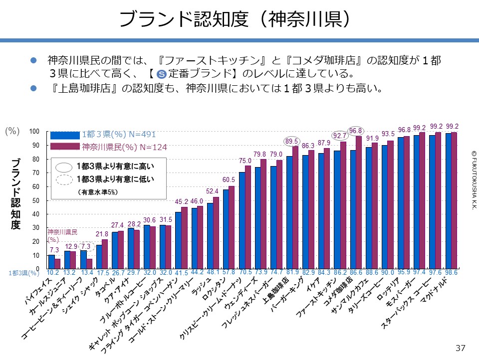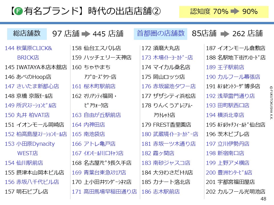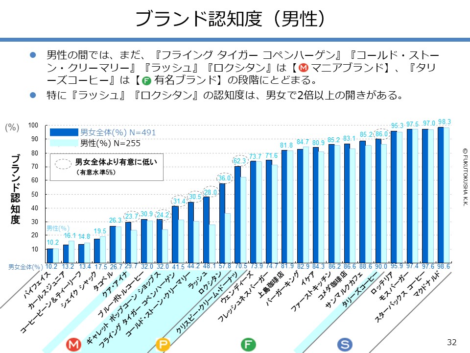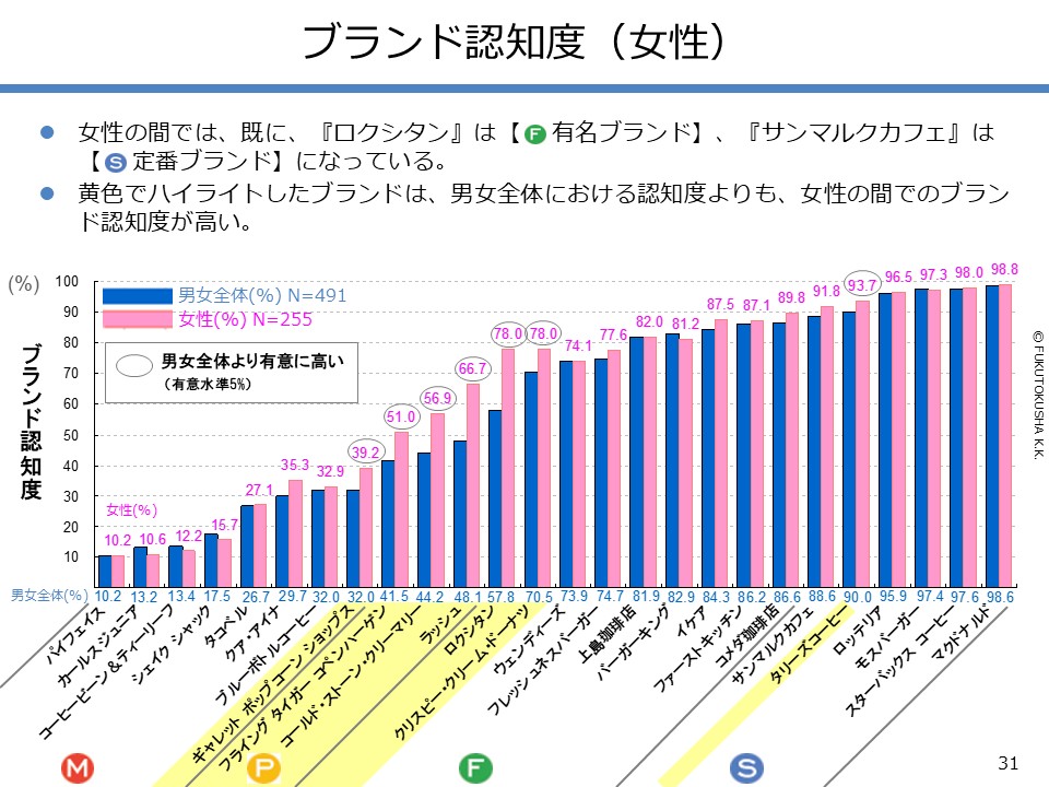 - 【調査結果のMPFS分析】 ①調査対象ブランドのMPFS分類 ②ブランド認知度(1都3県) ③利用経験率(1都3県) ④認知度と利用経験率の関係 ⑤認知者に占める未利用者の割合 ⑥ブランド認知度と店舗数の関係 ⑦利用経験率と店舗数の関係 ⑧認知度とブランド・エイジの関係 ⑨定番化するために必要な店舗数 ⑩定番化するための出店戦略