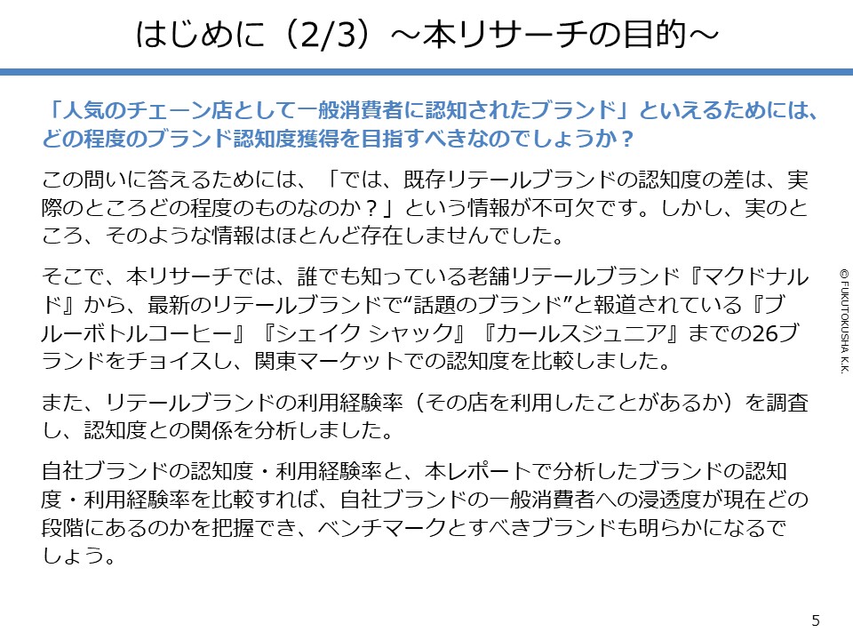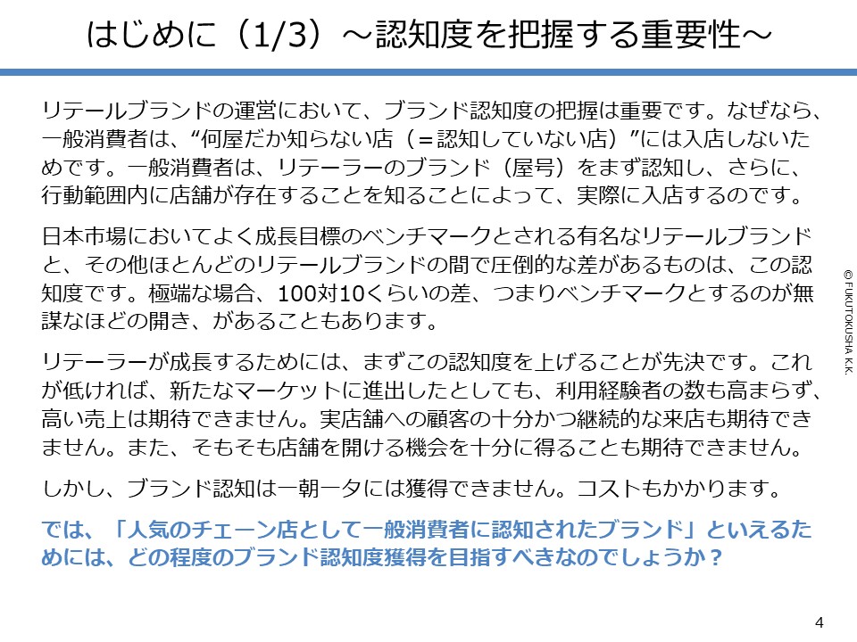 - 【調査目的・概要】 ①認知度を把握する重要性 ②リサーチの目的 ③本レポートの構成 ④調査概要