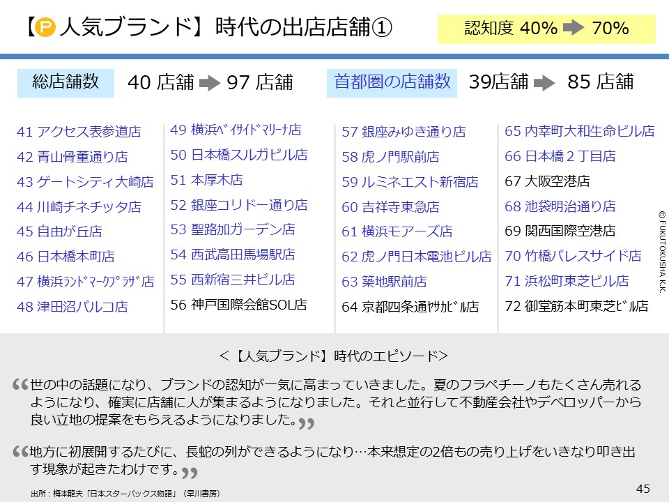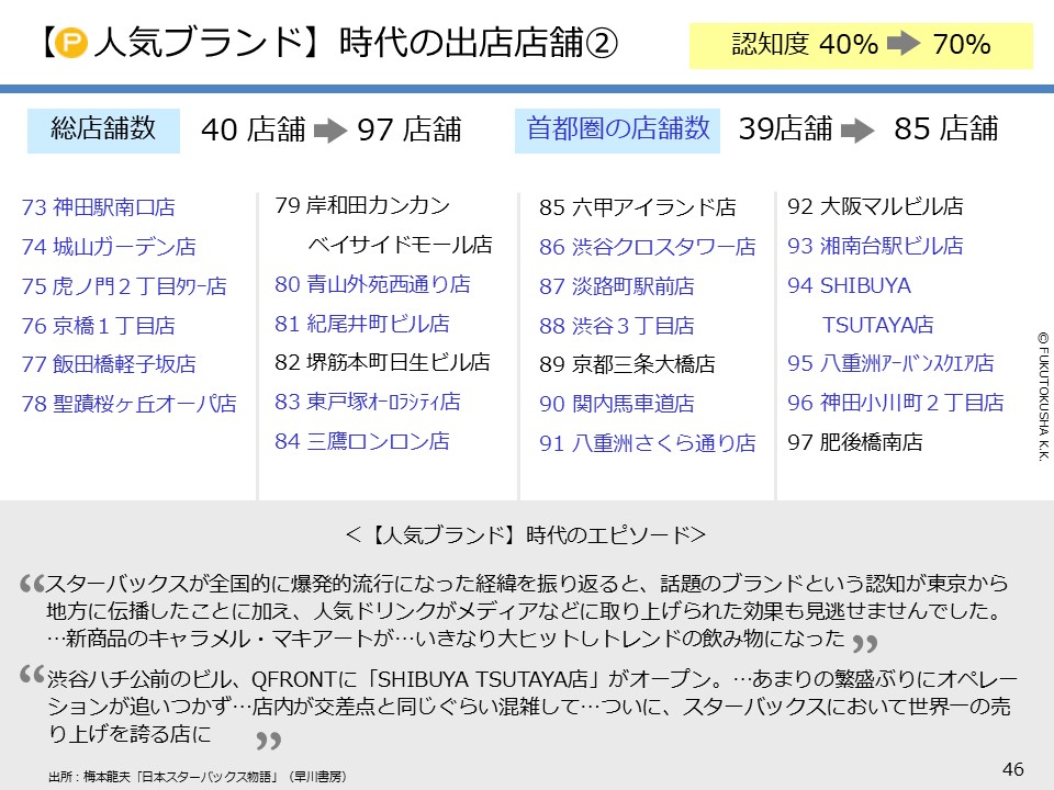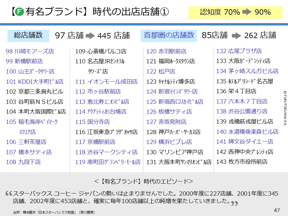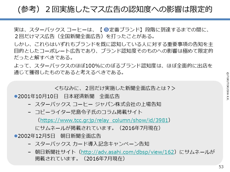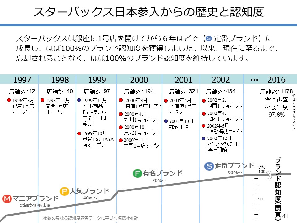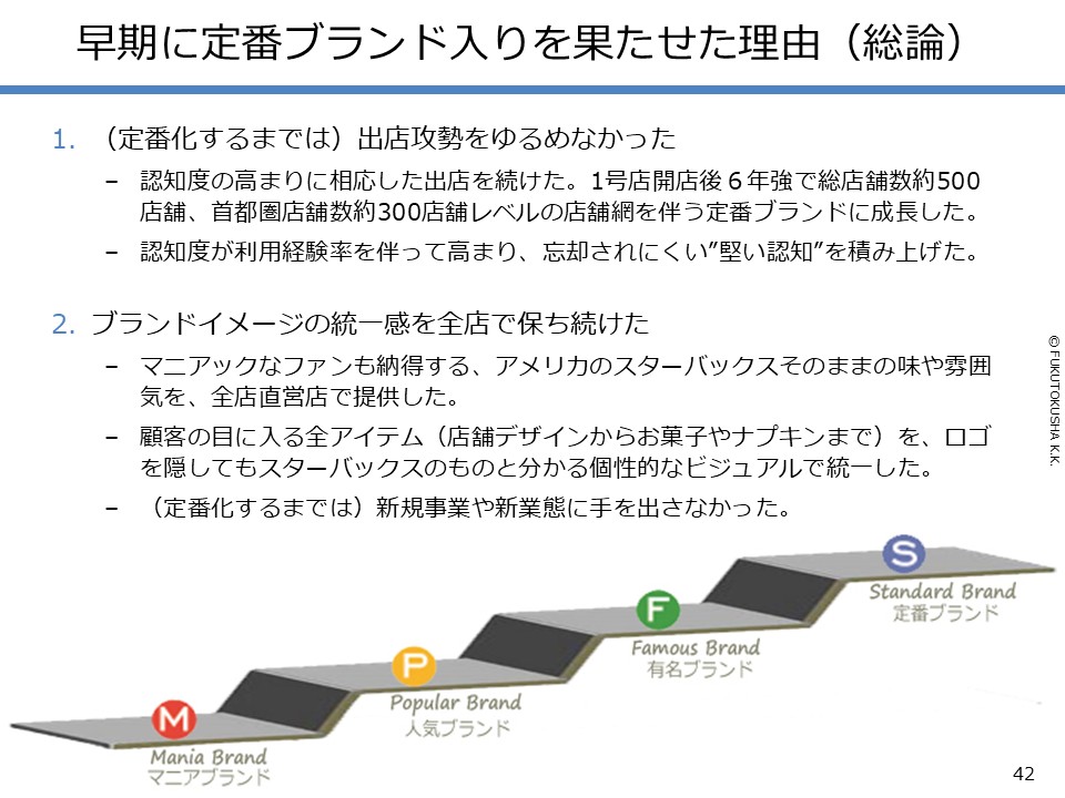 - 【スターバックスのケーススタディ】 ①日本参入からの歴史と認知度 ②早期に定番化できた理由(概論) ③早期定番化の理由(段階別各論) ④マニアブランド時代の出店店舗 ⑤人気ブランド時代の出店店舗 ⑥有名ブランド時代の出店店舗 ⑦2回だけ実施したマス広告