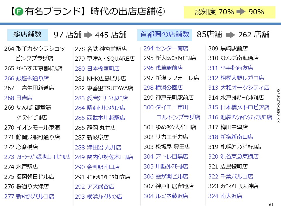 リテールブランドが「定番化」するまでの成長を「Mania マニア → Popular 人気 → Famous 有名 → Standard 定番」の4段階に分類した『MPFSモデル』というフレームワークを作り、結果を分析しました。MPFSに沿った成長の例として、スターバックスの日本市場における認知度獲得と出店の軌跡もケースとしてまとめています。
