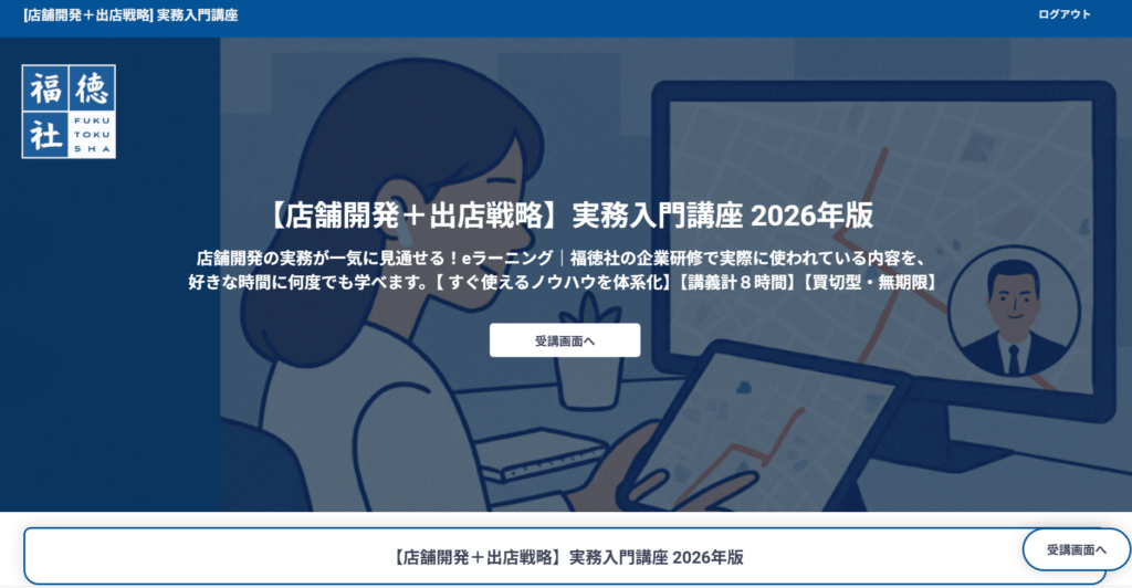 弊社セミナー「店舗開発実務講座」の動画講座版「店舗開発+出店戦略実務入門講座 (2026年版)」(税込33,000円)が大幅に内容拡充・リニューアルされ、より実践的・網羅的になりました。復習や要点確認に活用いただける講義テキストも各レッスンに追加されました。▼ 講座の詳細・受講画面はこちら ▼(一部無料公開中)
