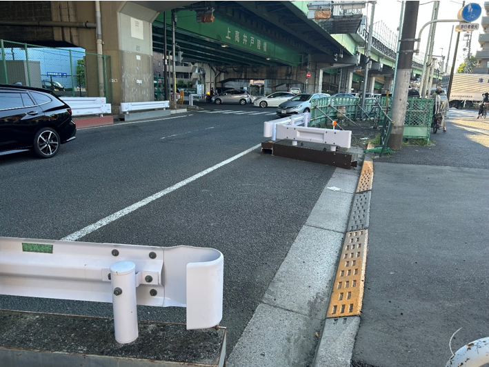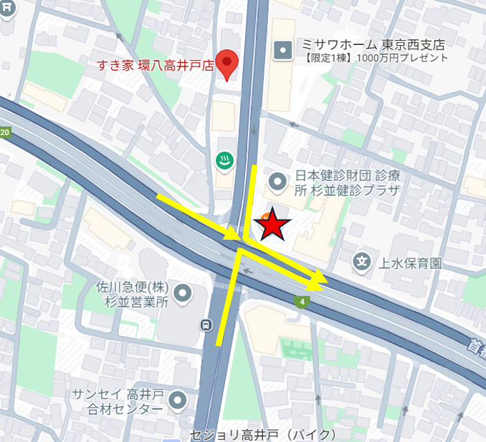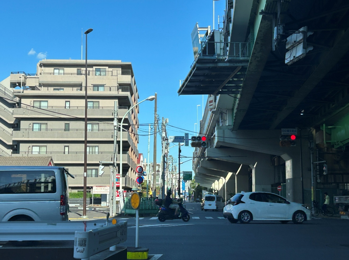 首都高速の真下で、店舗の直前道路は一方通行であり、対向車線からの侵入は不可能であることが分かります。その先には、見にくいかもしれませんが首都高速・高井戸ICの入口のサインがあります。交差点を超えてすぐ左に駐車場入口があることが“事前に分かっていれば”確認できます。