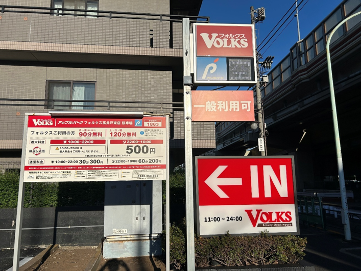 この駐車場は一般利用を兼ねています。また、フォルクスを利用しても平日は90分、土日祝日も120分しか無料とはならないことが分かります。休日に家族等でステーキを食べに来たら、多くの客が2時間以上は滞在するような気がします。平日も、特に夜間に90分を意識してステーキを食べるのは、個人的には落ちつかないですね。